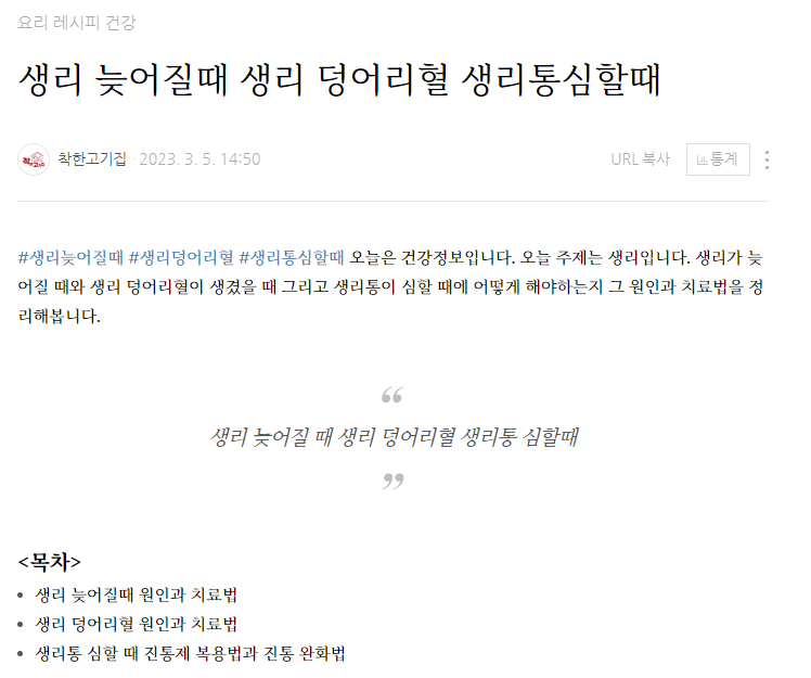 아래 사진을 누르시면 생리가 늦어질 때와 생리 덩어리혈 그리고 생리통 심할 때 대처법을 정리한 문서로 이동합니다.